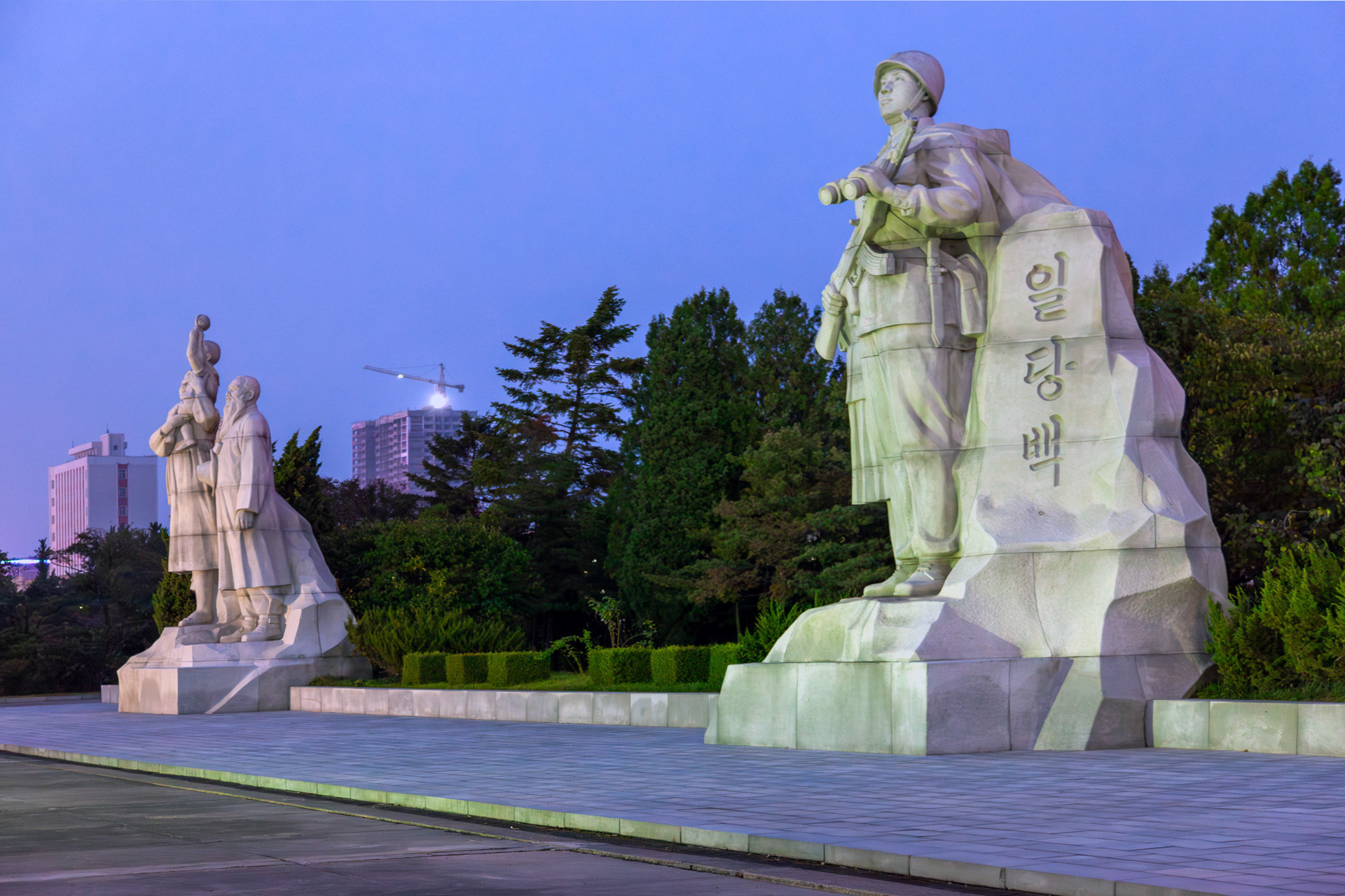 Situated on the east bank of the Taedong River, precisely aligned with Kim Il Sung Square across the water, the tower asserts itself as both a visual axis and an ideological counterpoint within the urban landscape. Its tapering, four-sided granite spire—150 metres high and clad in pale stone—is segmented into seventy divisions and constructed from 25,550 individual blocks, each representing a day in Kim Il Sung’s life. This numerical symbolism, typical of North Korean commemorative architecture, transforms biography into monumental permanence.