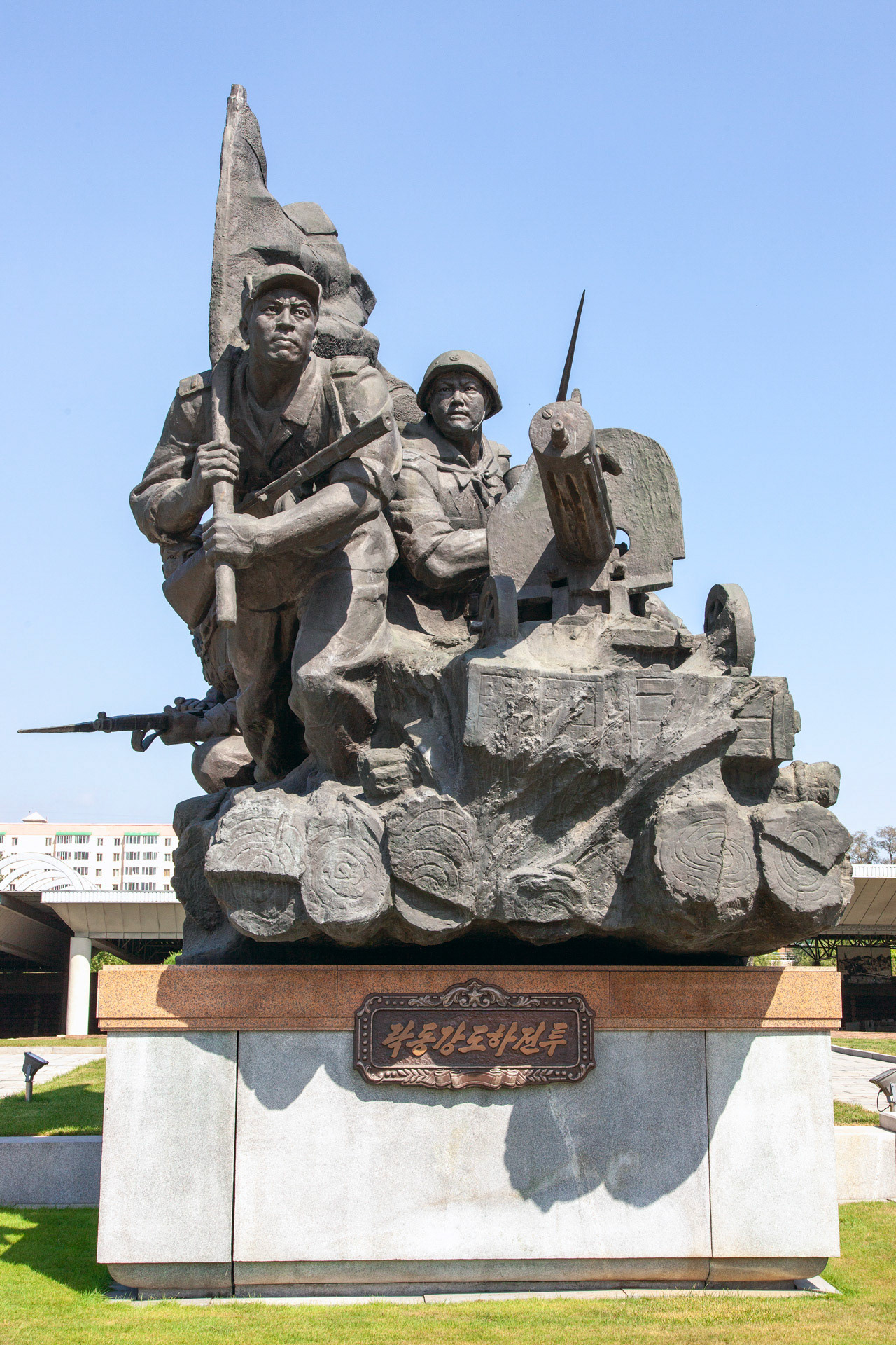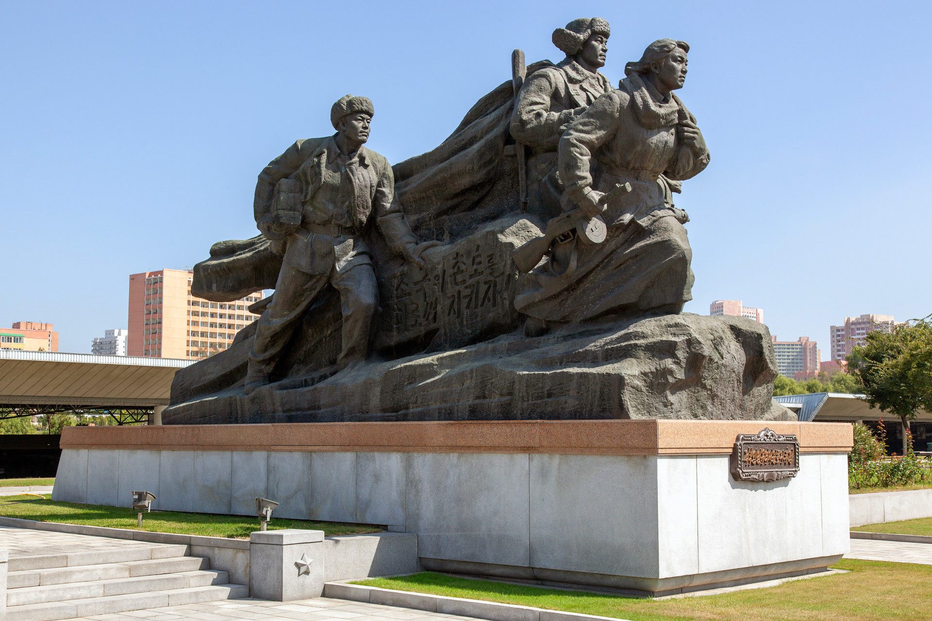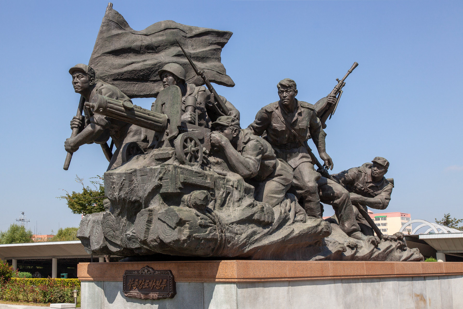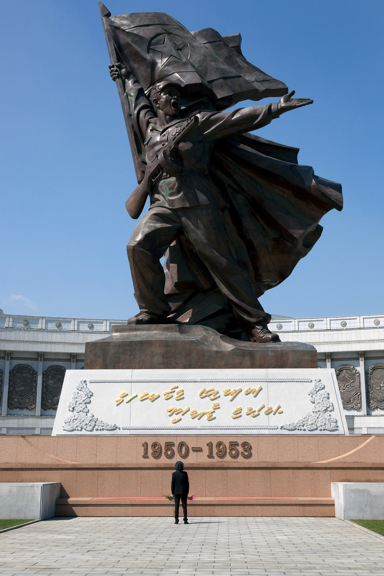 Photographic Series: North Korea, 2017 The Monument to the Victorious Fatherland Liberation War in Pyongyang rises prominently outside the eponymous museum, a sculptural homage to the Korean People’s Army. At its heart, the Victory Statue captures a soldier triumphantly raising the North Korean flag, emblematic of the state’s enduring narrative of heroism. Completed in 1993 to mark the 40th anniversary of the Korean War’s end, the ensemble of statues evokes pivotal battles and commemorates the army’s diverse branches with austere monumentality. Nearby, on the banks of the Taedong River, the captured U.S. Navy spy ship USS Pueblo silently reinforces the site’s symbolic weight, a tangible relic of conflict and national pride.