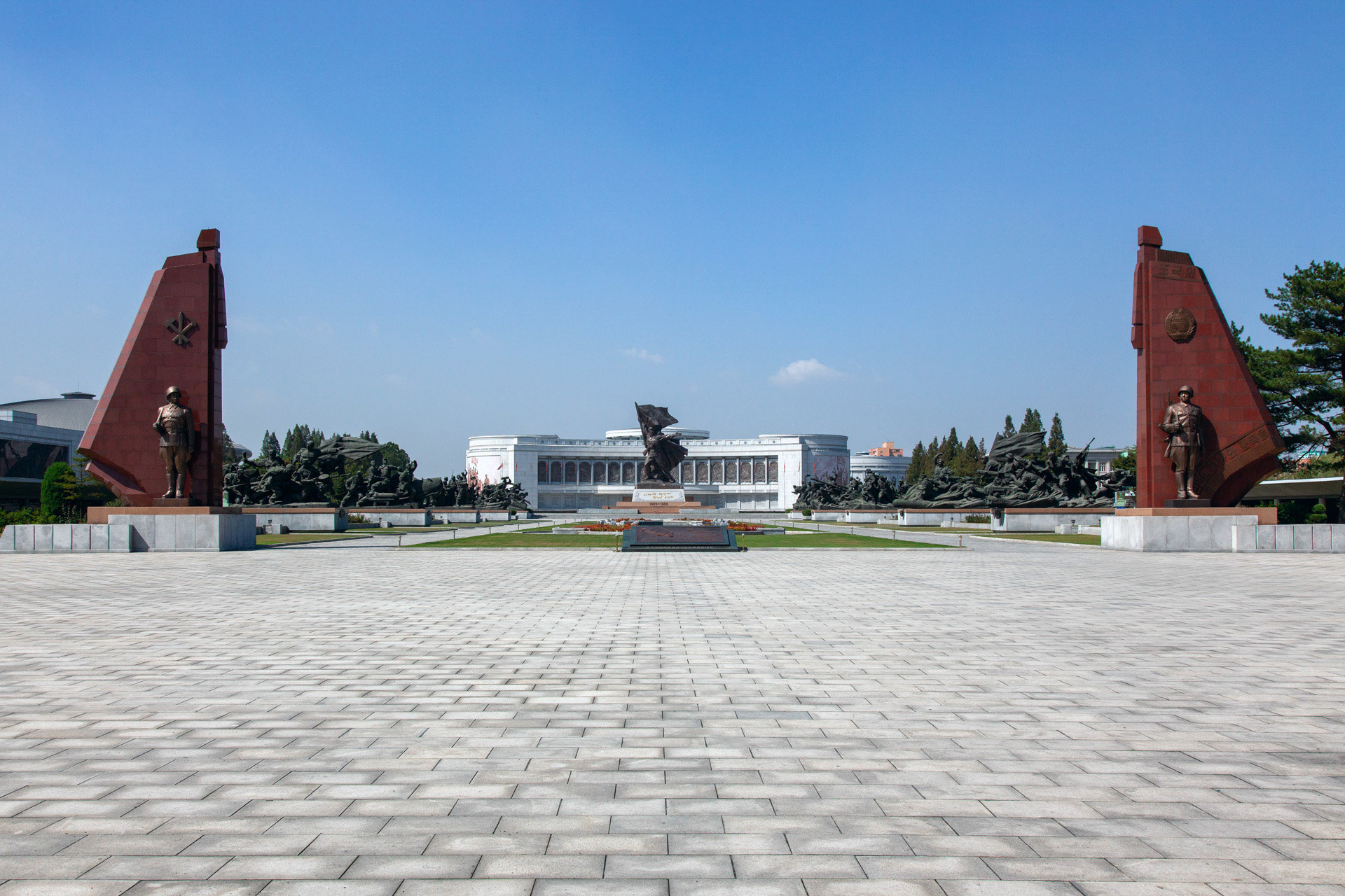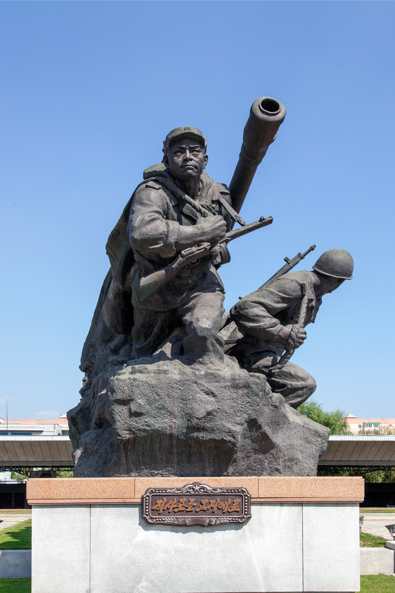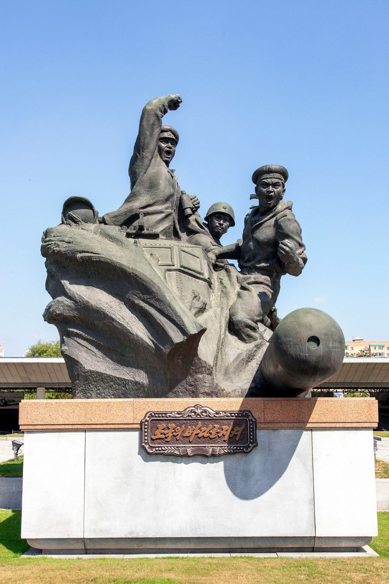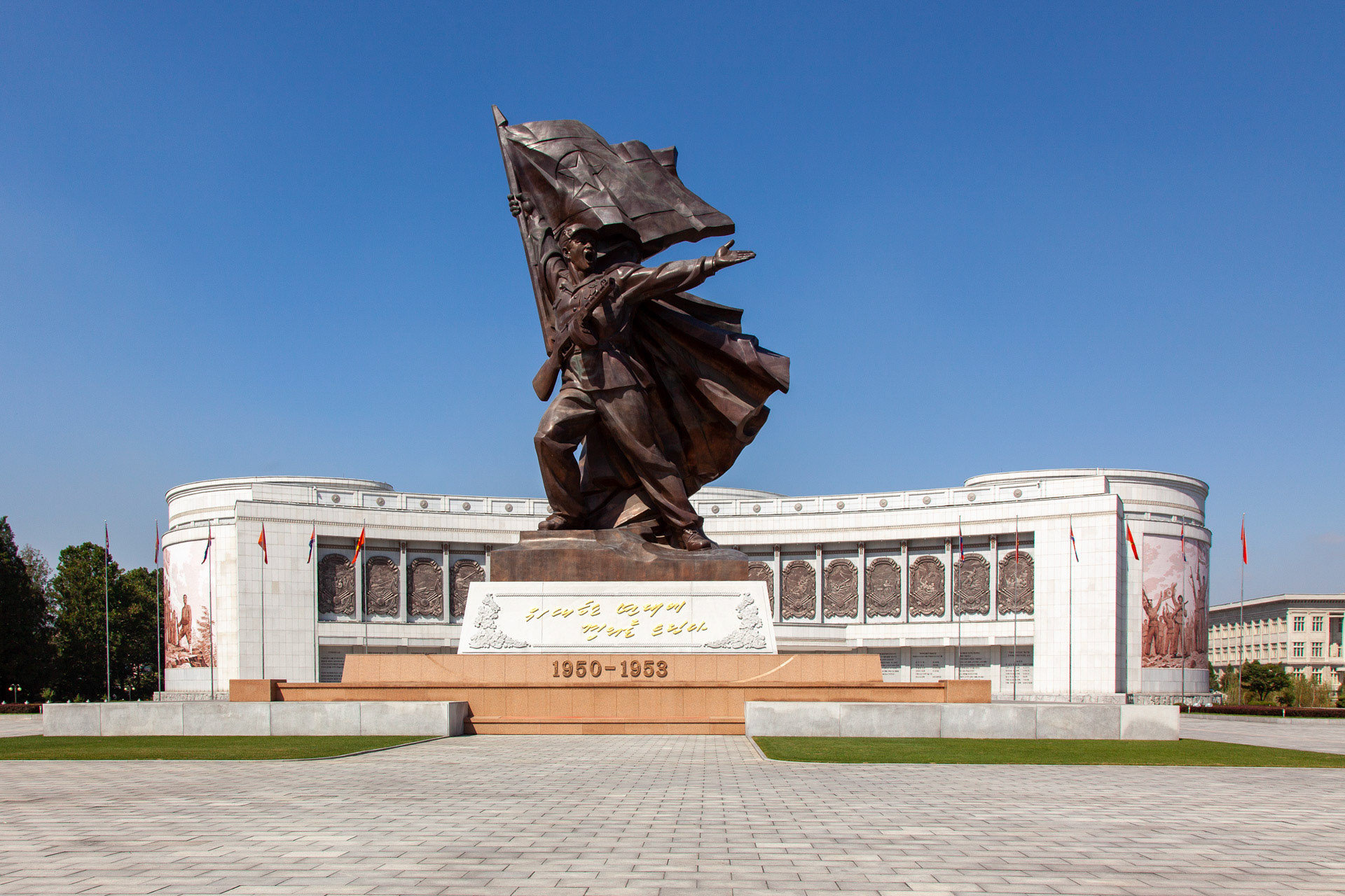 Photographic Series: North Korea, 2017 The Monument to the Victorious Fatherland Liberation War in Pyongyang rises prominently outside the eponymous museum, a sculptural homage to the Korean People’s Army. At its heart, the Victory Statue captures a soldier triumphantly raising the North Korean flag, emblematic of the state’s enduring narrative of heroism. Completed in 1993 to mark the 40th anniversary of the Korean War’s end, the ensemble of statues evokes pivotal battles and commemorates the army’s diverse branches with austere monumentality. Nearby, on the banks of the Taedong River, the captured U.S. Navy spy ship USS Pueblo silently reinforces the site’s symbolic weight, a tangible relic of conflict and national pride.