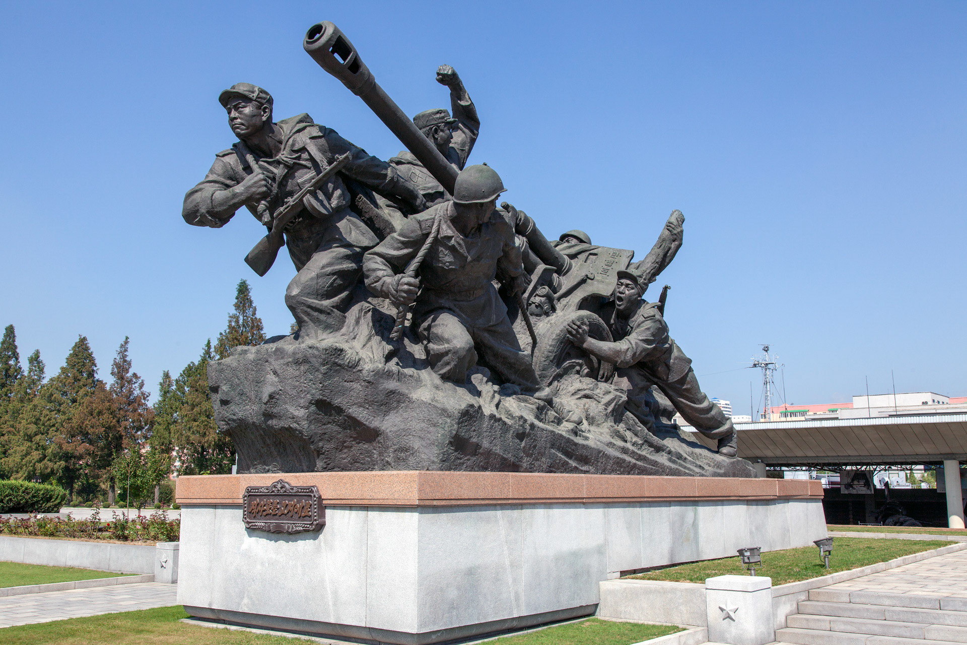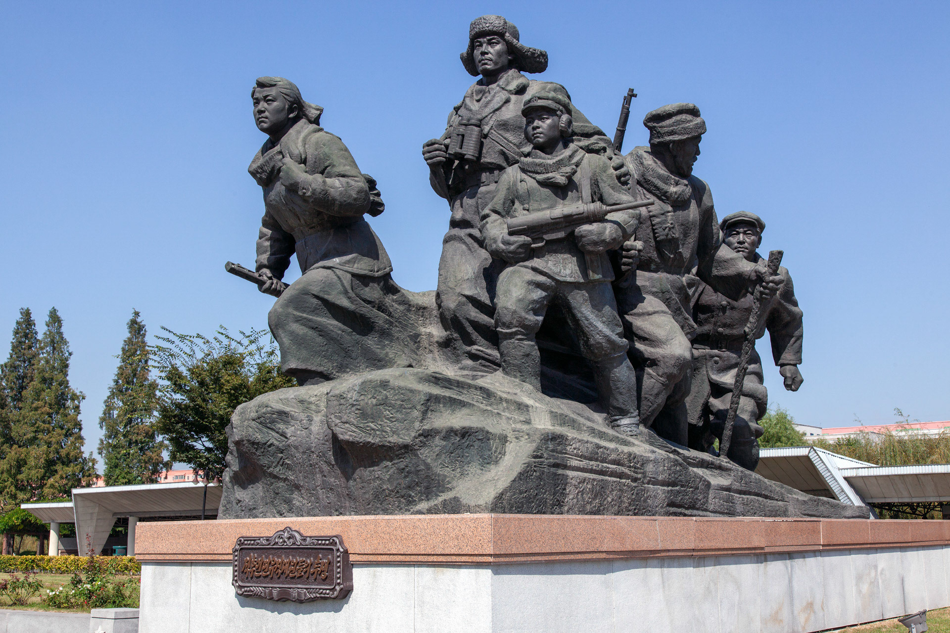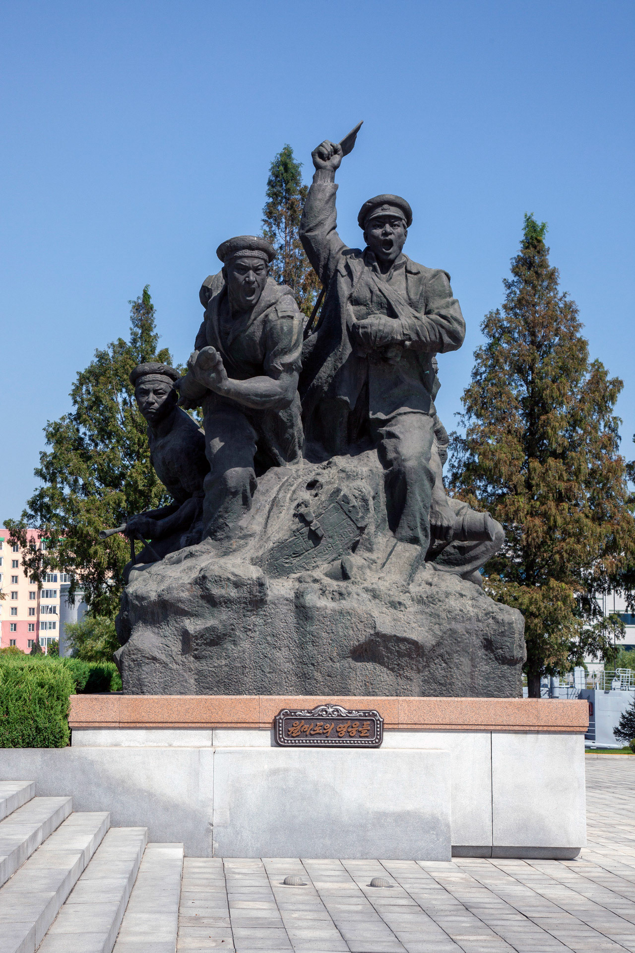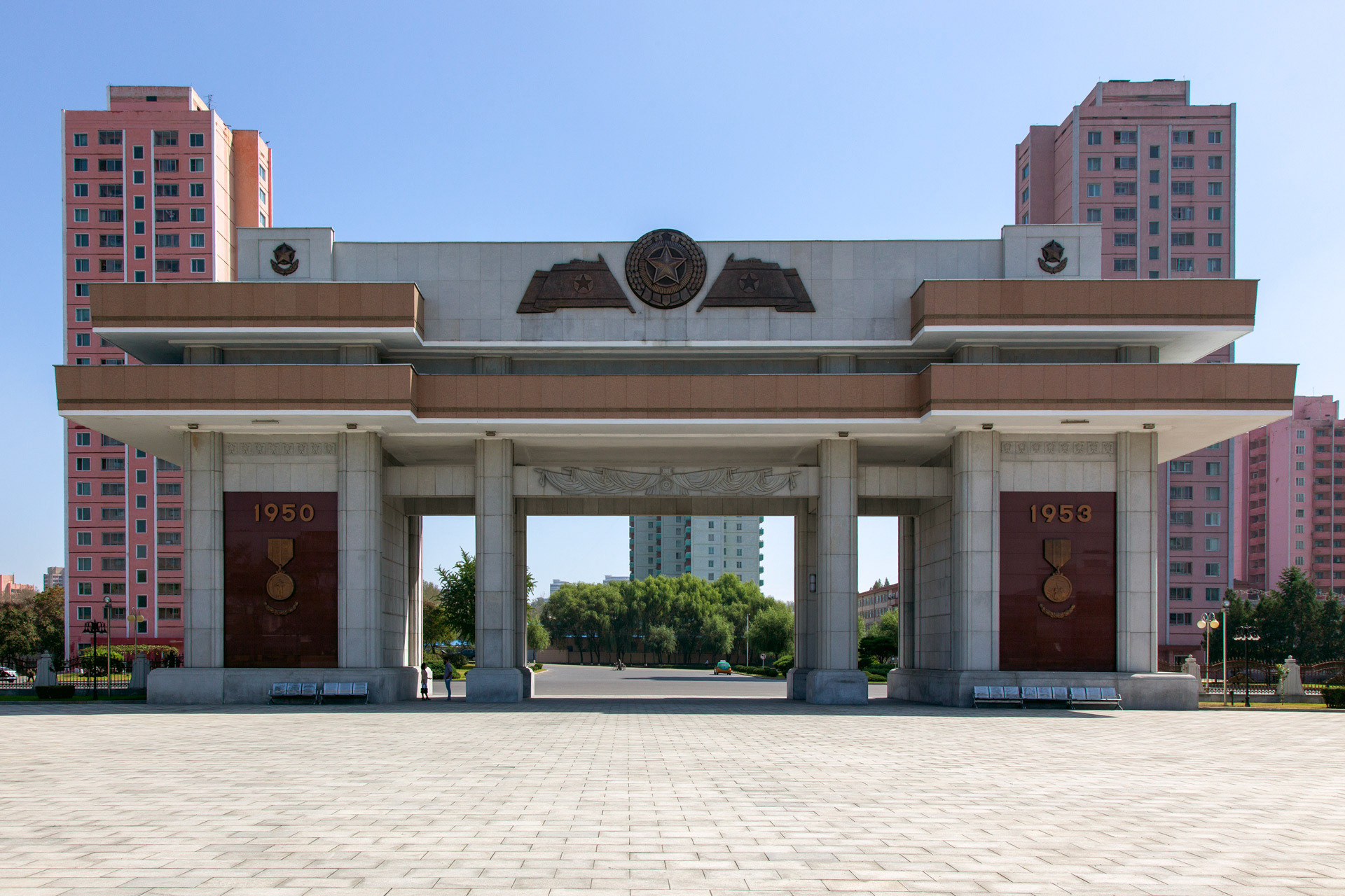 Photographic Series: North Korea, 2017 The Monument to the Victorious Fatherland Liberation War in Pyongyang rises prominently outside the eponymous museum, a sculptural homage to the Korean People’s Army. At its heart, the Victory Statue captures a soldier triumphantly raising the North Korean flag, emblematic of the state’s enduring narrative of heroism. Completed in 1993 to mark the 40th anniversary of the Korean War’s end, the ensemble of statues evokes pivotal battles and commemorates the army’s diverse branches with austere monumentality. Nearby, on the banks of the Taedong River, the captured U.S. Navy spy ship USS Pueblo silently reinforces the site’s symbolic weight, a tangible relic of conflict and national pride.