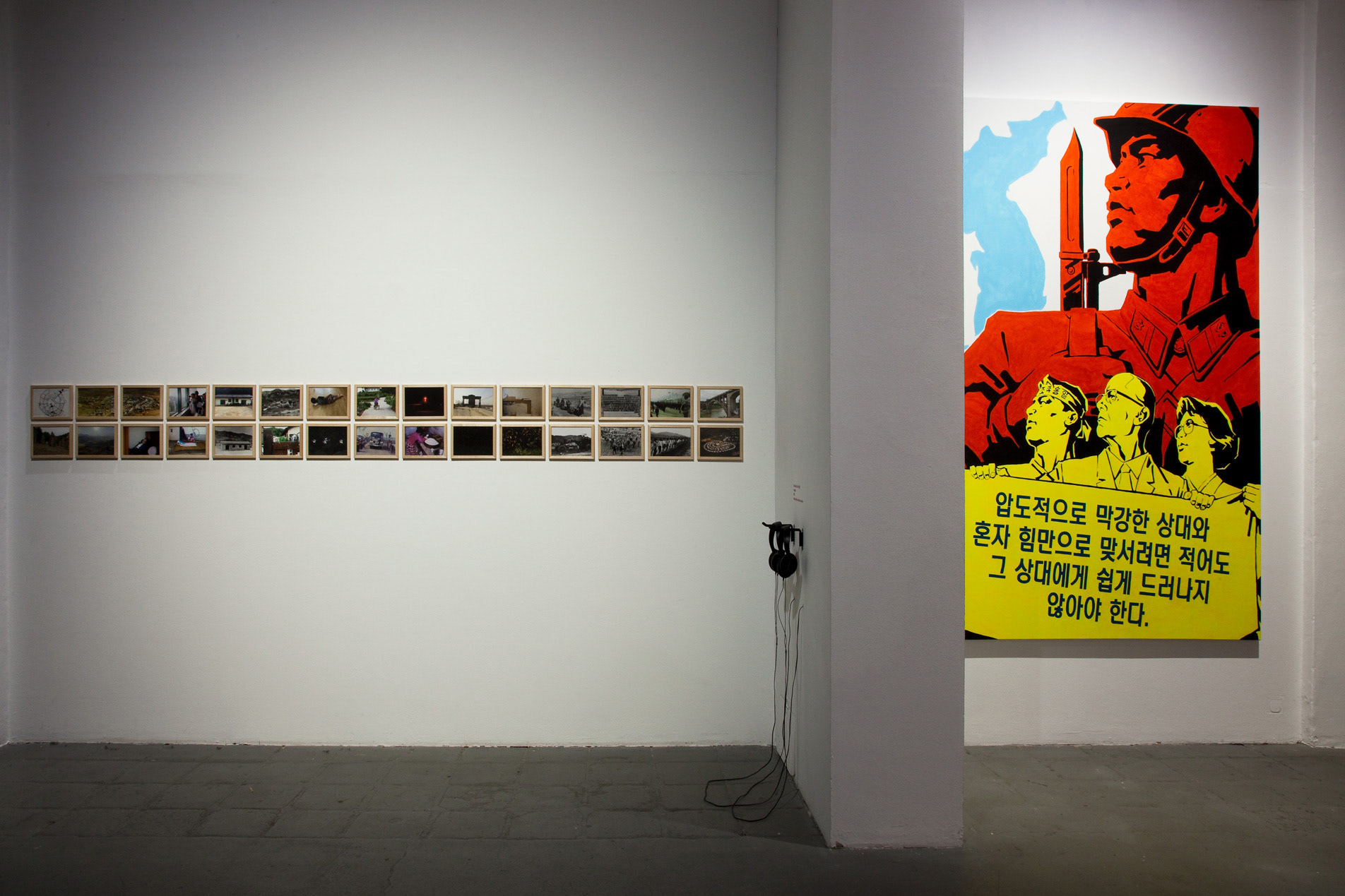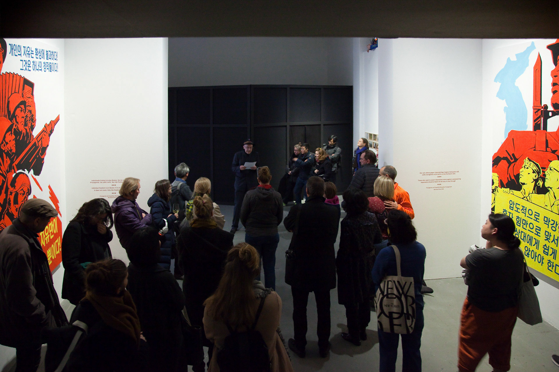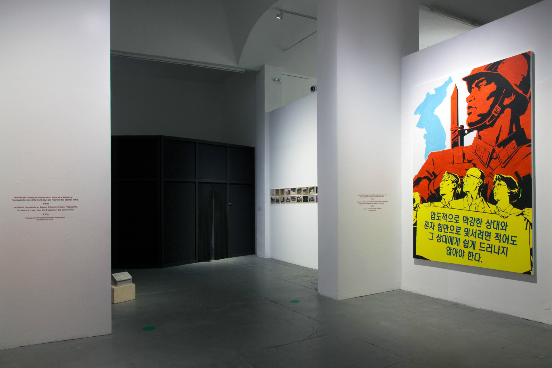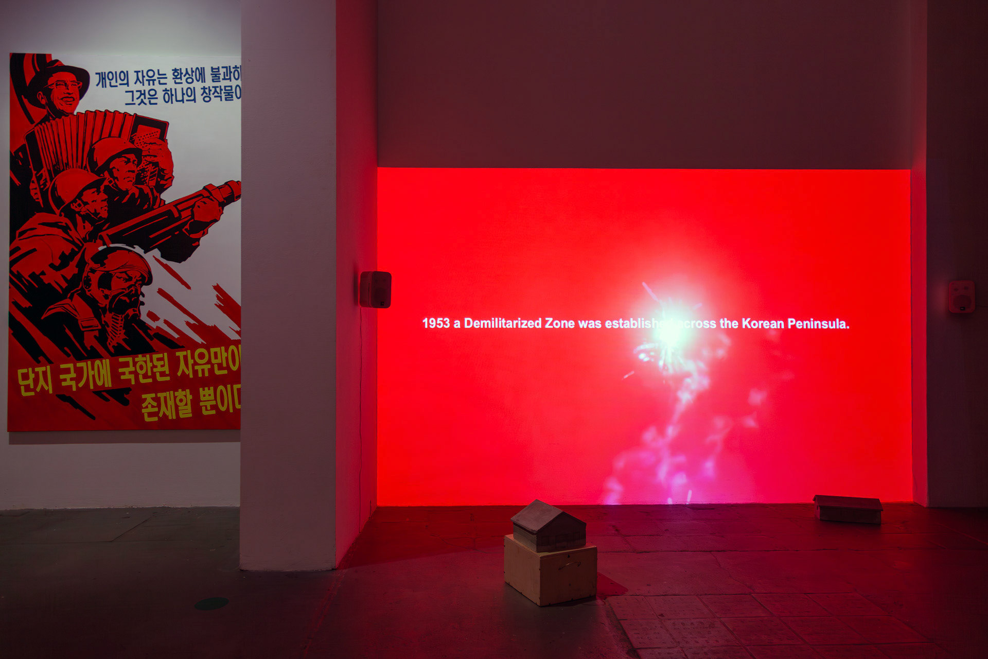 Meinblau Art Space, Berlin | 10 Nov – 3 Dec 2018 Curated by Bernhard Draz | Artists: Chan Sook Choi, Byungjun Kwon, Bernhard Draz, Georg Klein FACING NORTH KOREA brings together two South Korean and two German artists who explore the country and its regime with openness, nuance, and beyond familiar clichés. Chan Sook Choi presents Yangjiri, an installation of video, objects, and archival photography. It reflects the Yangjiri villages of the 1960s—propaganda settlements near the DMZ where North Korean refugees were forced to live in facades-only dwellings facing north. Choi transforms these constrained architectures into cinematic, hybrid spaces that seem to extend infinitely. Byungjun Kwon’s Forest of Subtle Truth 3 sonically interprets Kyodong Island, a civilian zone just south of the DMZ. Using Local Positioning System-guided headphones, visitors experience the interplay of historical voices, propagandistic broadcasts, natural sounds, and lingering military tension. Bernhard Draz’s Empathic Propaganda stems from his 2017 DPRK visit. Engaging directly with North Korean visual language, he inserts himself into large-scale acrylic paintings, replacing martial slogans with reflections on the country’s self-image, revealing empathy, humor, and human complexity behind the propaganda. Georg Klein’s The Sound before Silence – Souvenirs from North Korea transforms an encounter with a North Korean guide singing Kimilsungia into a performative audio-visual narrative. Collaborating with South Korean Gayageum player Youjin Sung, Klein stages a musical dialogue bridging the North-South divide, capturing the tension, intimacy, and cultural resonance of his journey.