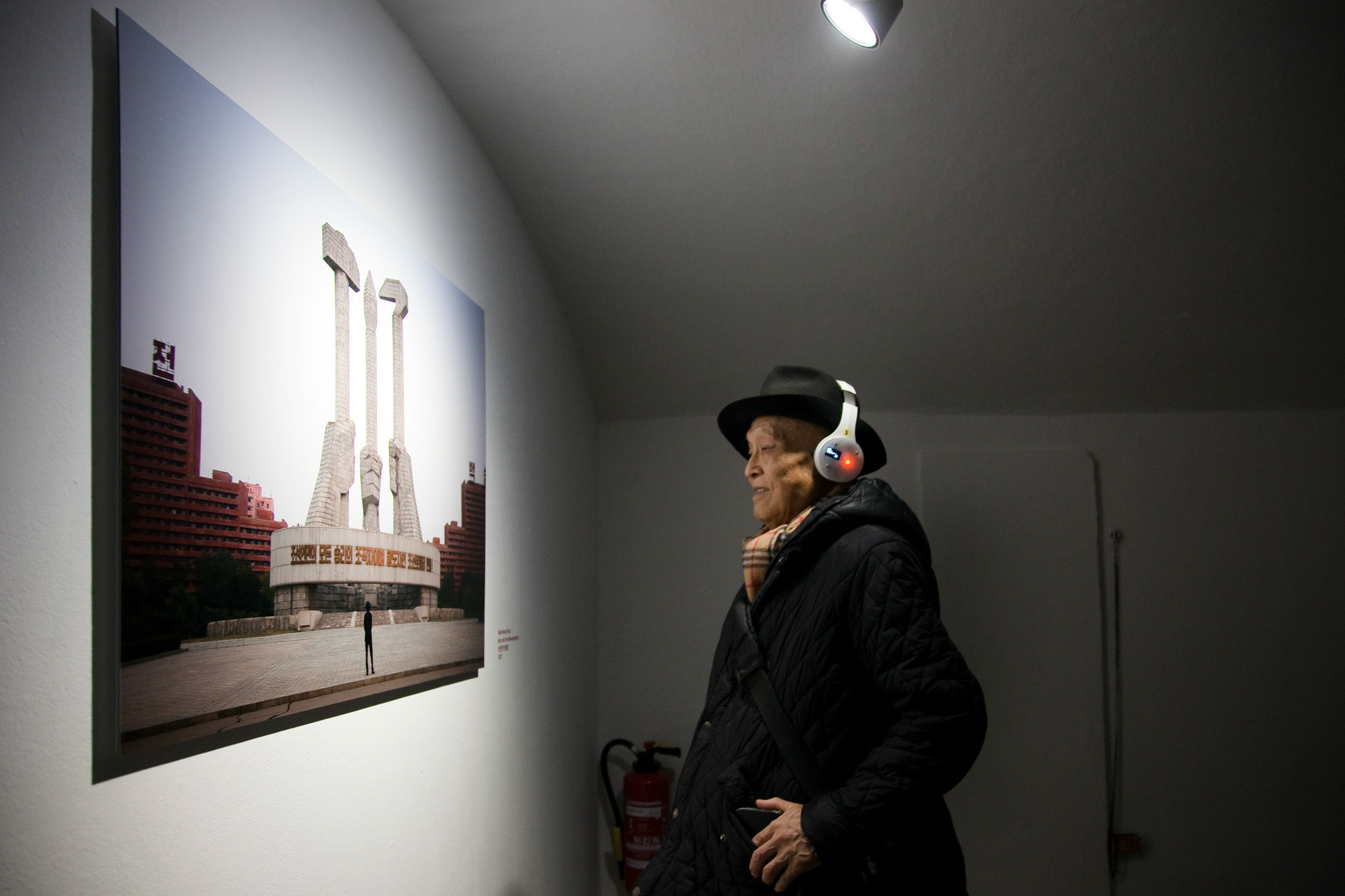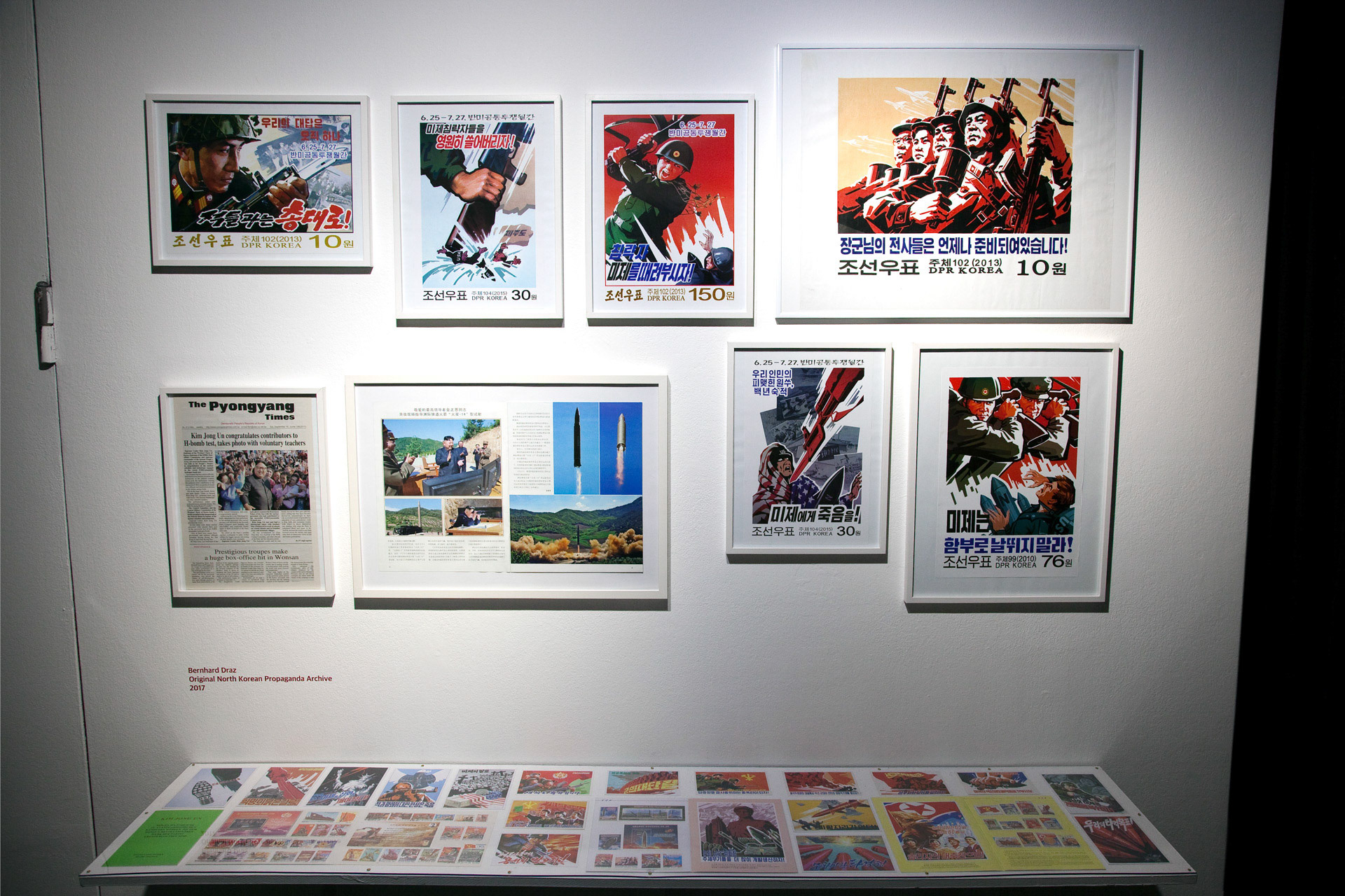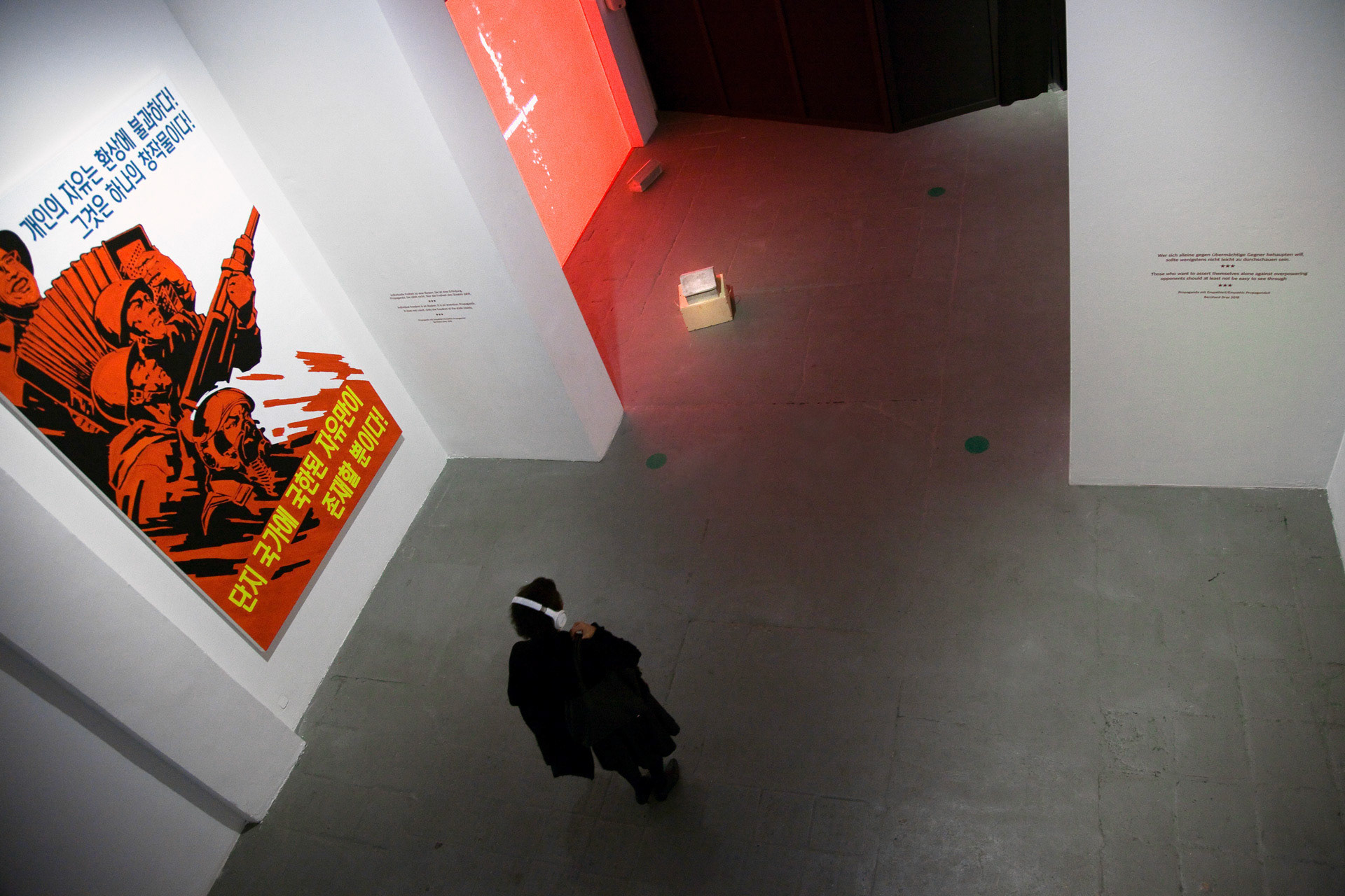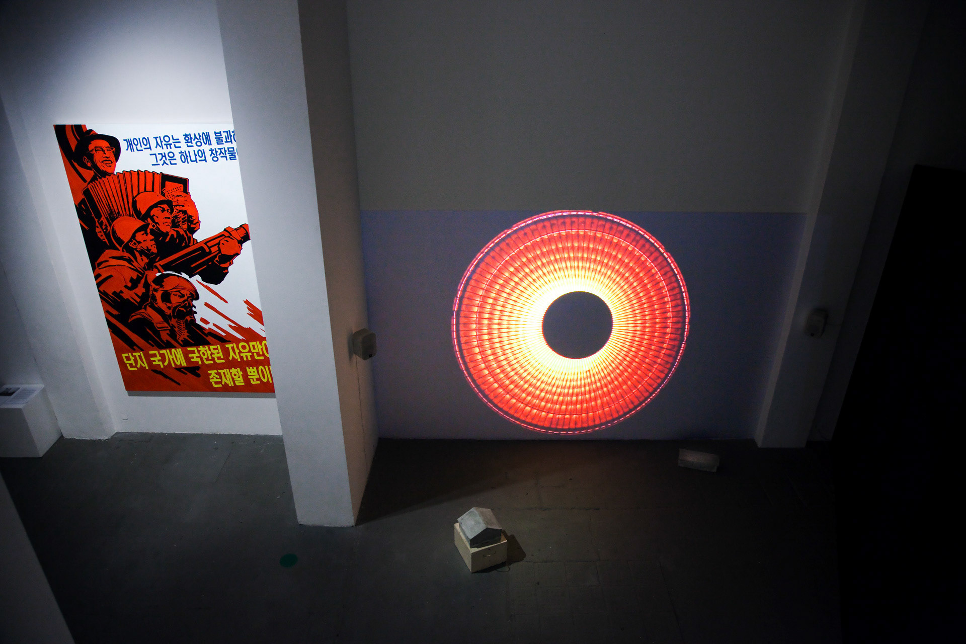 Meinblau Art Space, Berlin | 10 Nov – 3 Dec 2018 Curated by Bernhard Draz | Artists: Chan Sook Choi, Byungjun Kwon, Bernhard Draz, Georg Klein FACING NORTH KOREA brings together two South Korean and two German artists who explore the country and its regime with openness, nuance, and beyond familiar clichés. Chan Sook Choi presents Yangjiri, an installation of video, objects, and archival photography. It reflects the Yangjiri villages of the 1960s—propaganda settlements near the DMZ where North Korean refugees were forced to live in facades-only dwellings facing north. Choi transforms these constrained architectures into cinematic, hybrid spaces that seem to extend infinitely. Byungjun Kwon’s Forest of Subtle Truth 3 sonically interprets Kyodong Island, a civilian zone just south of the DMZ. Using Local Positioning System-guided headphones, visitors experience the interplay of historical voices, propagandistic broadcasts, natural sounds, and lingering military tension. Bernhard Draz’s Empathic Propaganda stems from his 2017 DPRK visit. Engaging directly with North Korean visual language, he inserts himself into large-scale acrylic paintings, replacing martial slogans with reflections on the country’s self-image, revealing empathy, humor, and human complexity behind the propaganda. Georg Klein’s The Sound before Silence – Souvenirs from North Korea transforms an encounter with a North Korean guide singing Kimilsungia into a performative audio-visual narrative. Collaborating with South Korean Gayageum player Youjin Sung, Klein stages a musical dialogue bridging the North-South divide, capturing the tension, intimacy, and cultural resonance of his journey.