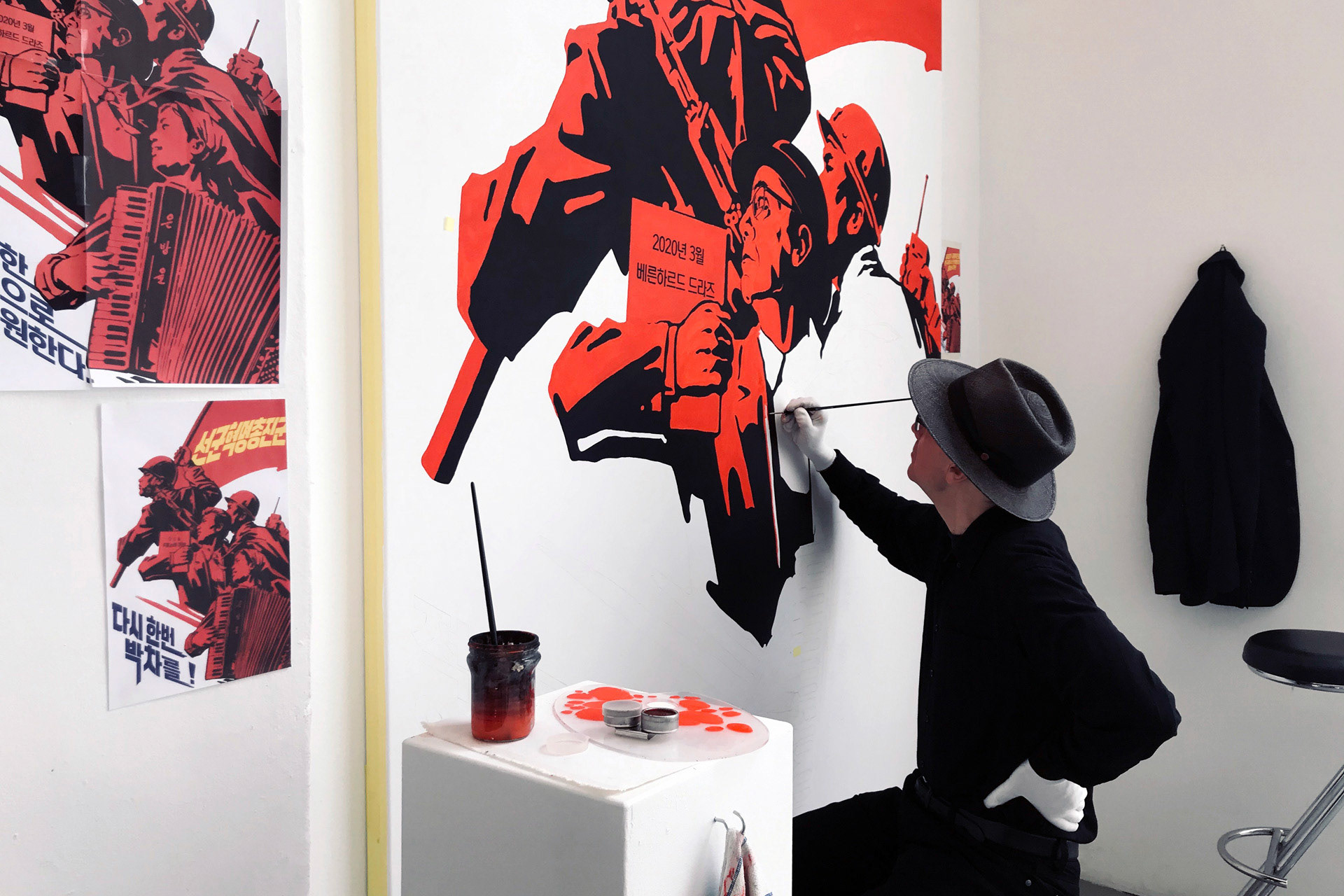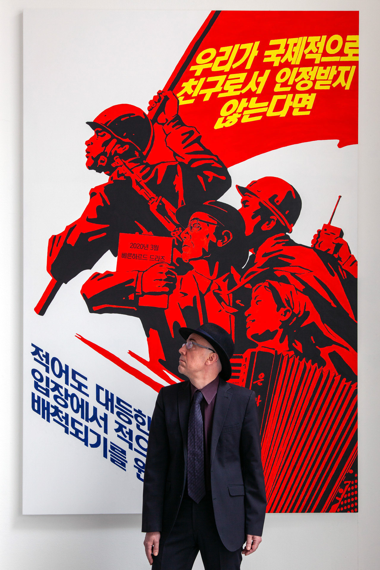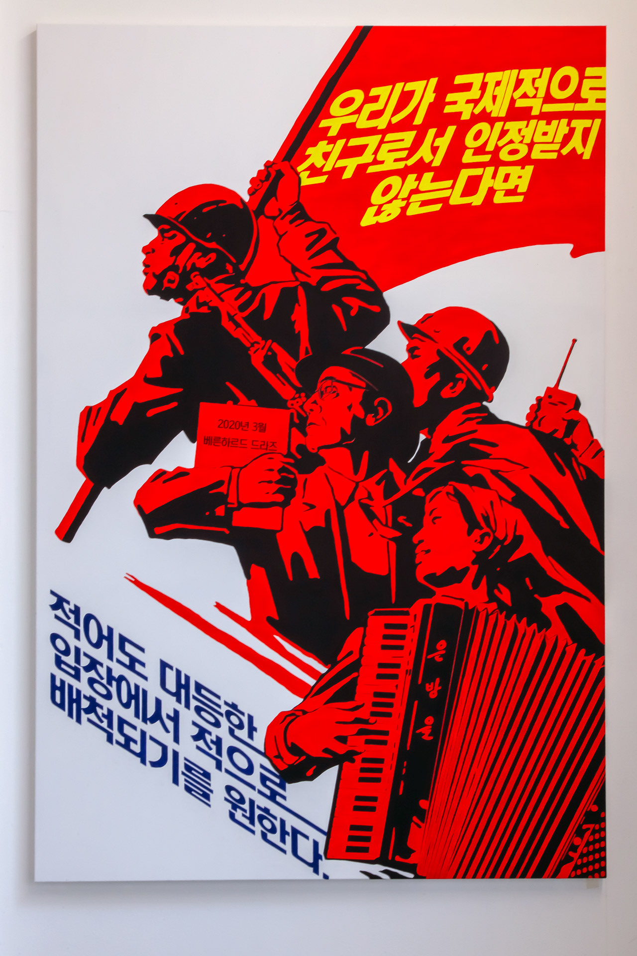 “If we are not respected as a friend on the international stage, then at the very least we wish to be condemned as an enemy on equal footing.” Empathic Propaganda (2018–2025) Empathic Propaganda is a series of large-scale paintings, drawings, and silkscreens based on North Korean propaganda posters. I replace a central figure with my self-portrait and substitute the original militant slogans with alternative quotations translated into Korean. While the originals glorify the Kim regime and Chuch’e ideology, the inserted quotations offer a more nuanced insight into North Korea’s self-conception. Satirical and provocative, the project also explores imaginative empathy toward thought systems alien to liberal-democratic assumptions.
