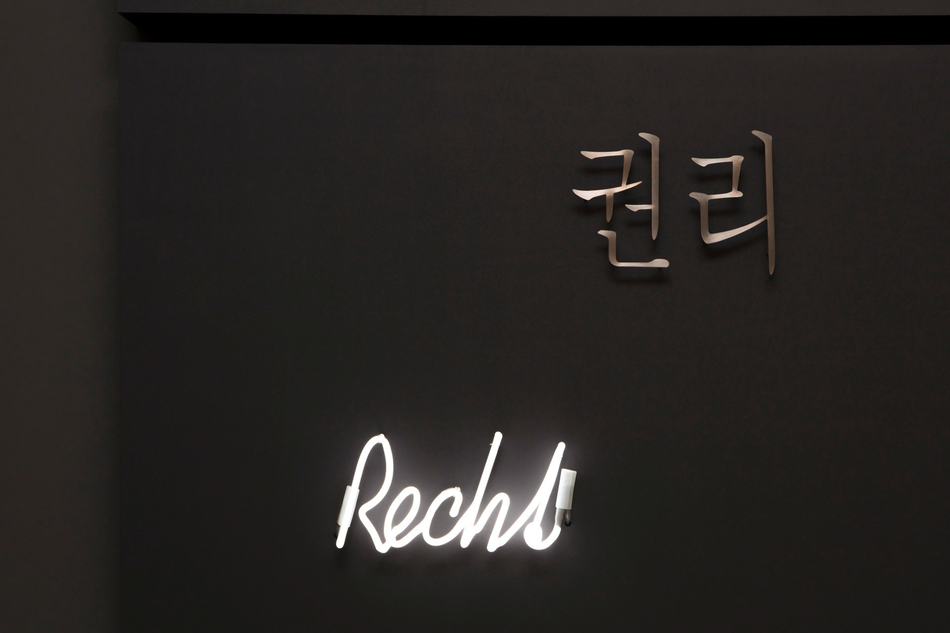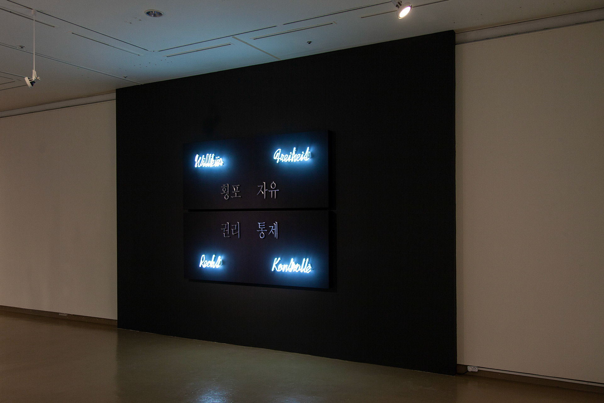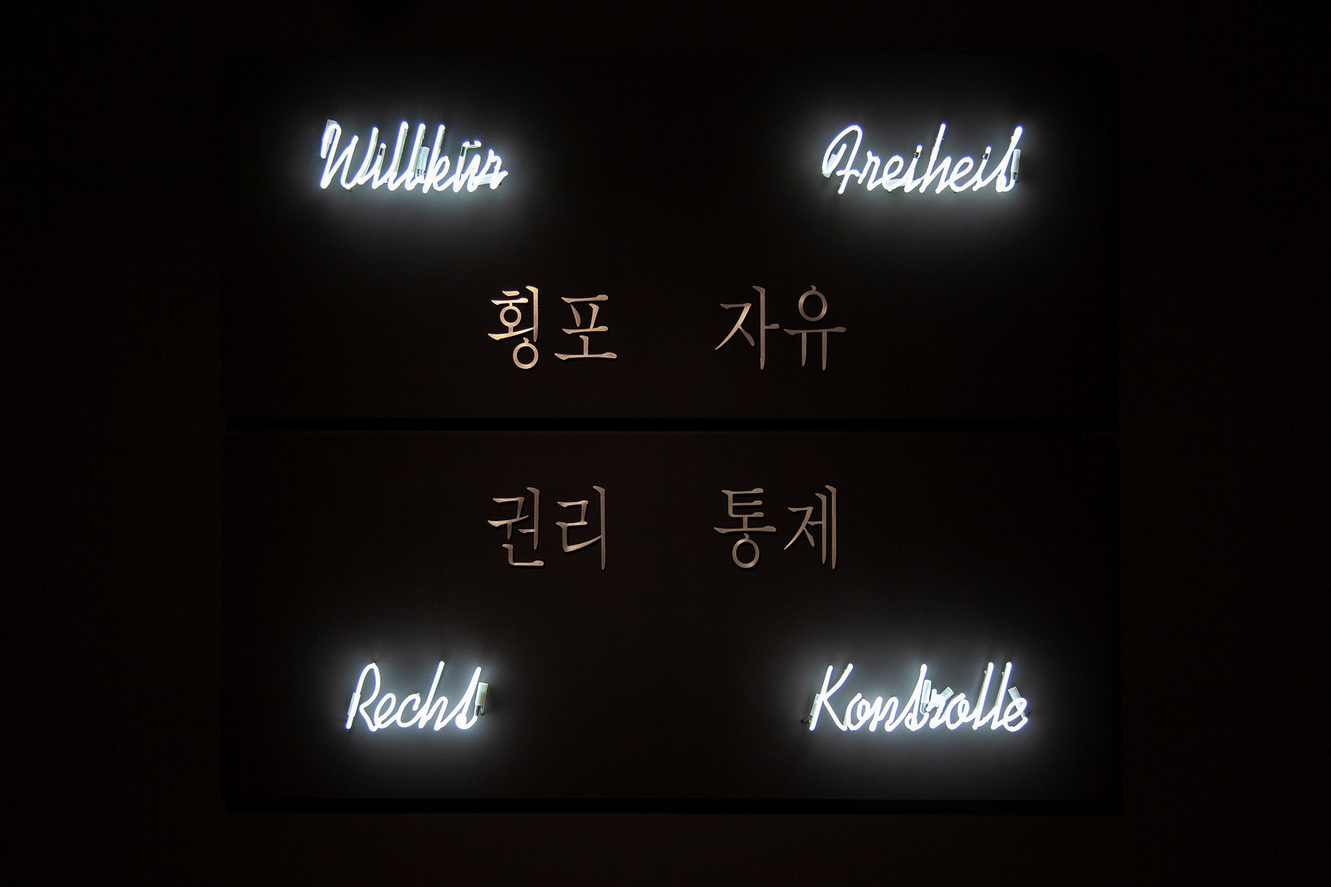 Changwon Sculpture Biennale 2022 Seongsan Art Hall | Changwon | Republic of Korea The divisions of Germany and Korea are often invoked as comparable, yet the historical, cultural, and geopolitical asymmetries between them undermine any easy analogy. My installation Transitional Justice – Terminology engages this tension by examining how societies emerging from authoritarian rule or conflict negotiate the transition toward democracy and accountability. Focusing on the charged concepts of arbitrariness, freedom, law/right, and control, the work probes how their meanings shift across ideological systems and national histories. Such abstractions resist direct translation: while Recht in German carries a precise juridical contour, Korean differentiates among multiple, context-specific terms. Seven decades of divergent developments in North and South Korea have further fractured these semantic fields.