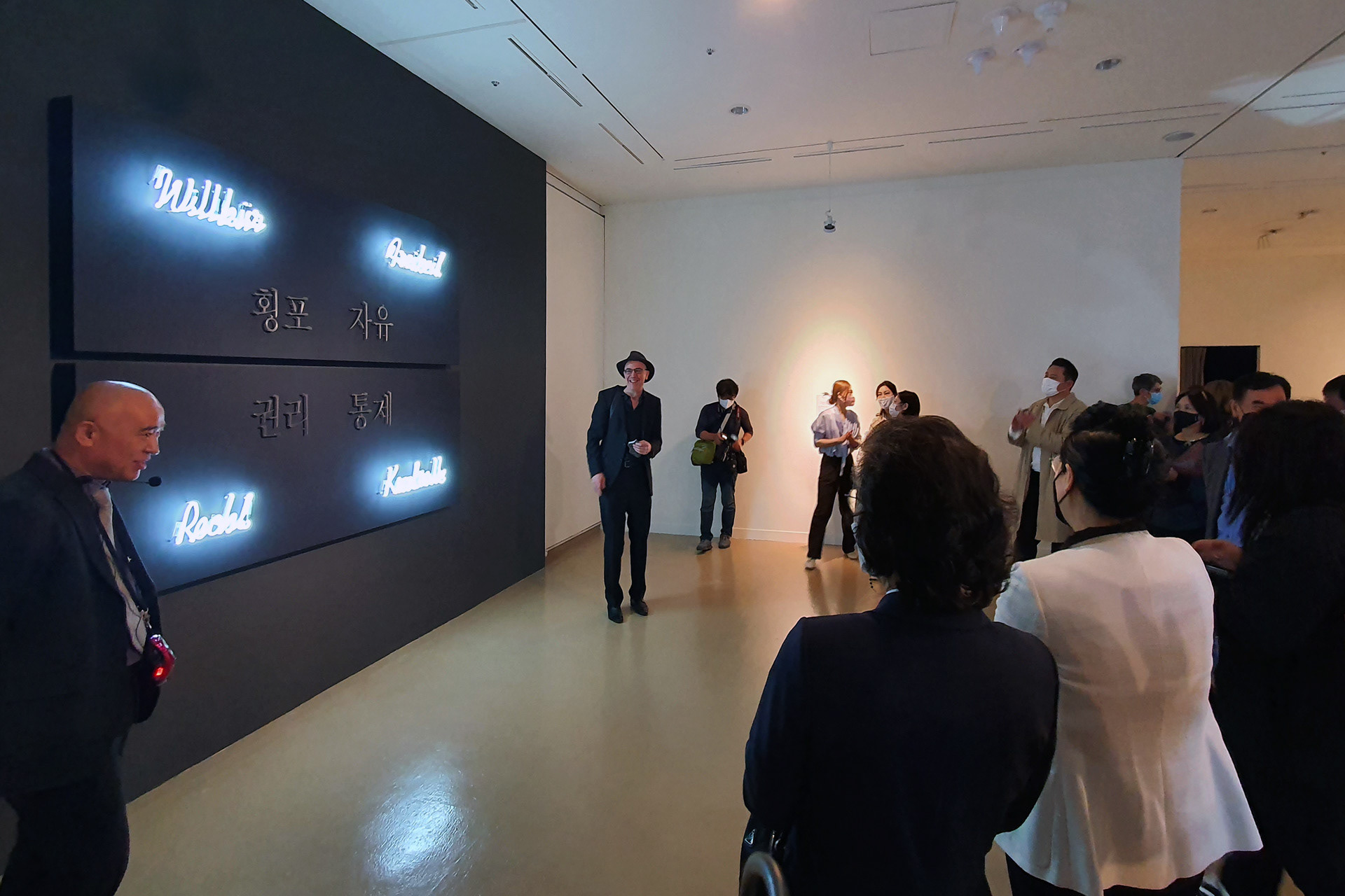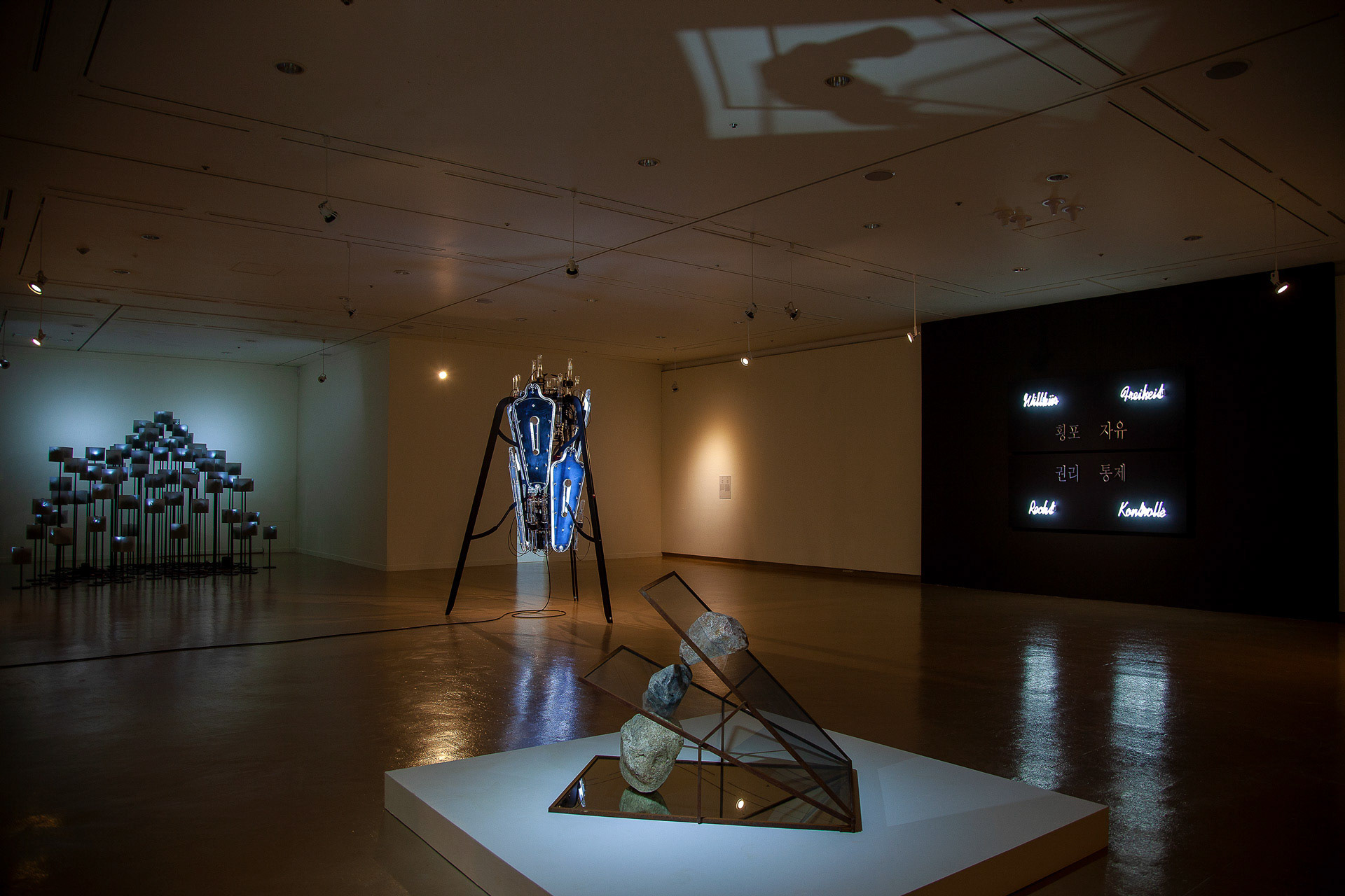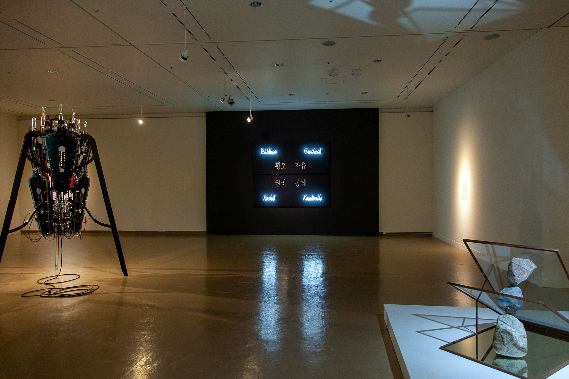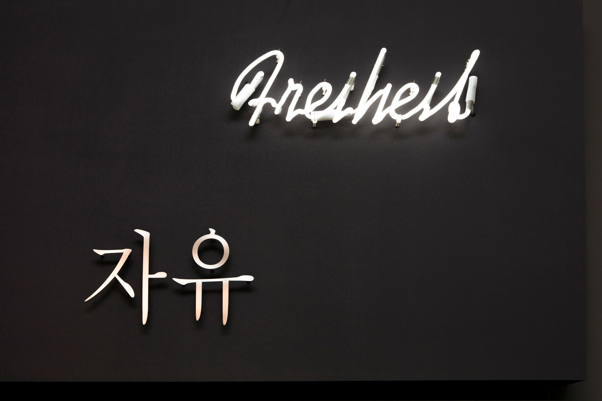 Changwon Sculpture Biennale 2022 Seongsan Art Hall | Changwon | Republic of Korea The divisions of Germany and Korea are often invoked as comparable, yet the historical, cultural, and geopolitical asymmetries between them undermine any easy analogy. My installation Transitional Justice – Terminology engages this tension by examining how societies emerging from authoritarian rule or conflict negotiate the transition toward democracy and accountability. Focusing on the charged concepts of arbitrariness, freedom, law/right, and control, the work probes how their meanings shift across ideological systems and national histories. Such abstractions resist direct translation: while Recht in German carries a precise juridical contour, Korean differentiates among multiple, context-specific terms. Seven decades of divergent developments in North and South Korea have further fractured these semantic fields.
